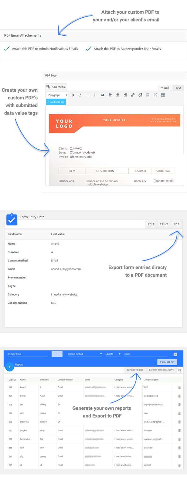 Export to PDF add-on for NEX-Forms will enable you to export form entries to PDF with a click of a button!