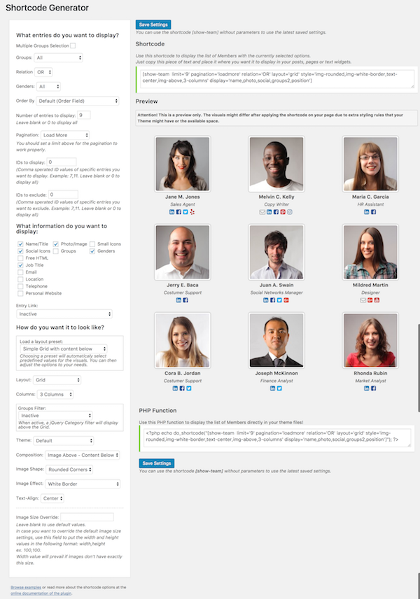 It couldn’t be more easy to generate the necessary code to display the entries. Just go to the Shortcode generator, choose the settings you want and the shortcode and the php function that you can use will be generated and ready to copy and paste where you want! Shortcodes are to be used in posts, pages and widgets, while the php function will be necessary if you want to hard code the team showcase layout in your theme files.