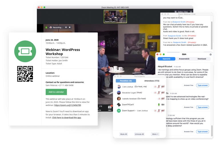 Sell access to virtual events directly from your WordPress website. FooEvents connects securely to your Zoom account and can automatically pre-register attendees for once-off or recurring Zoom meetings and webinars when they purchase tickets on your website.